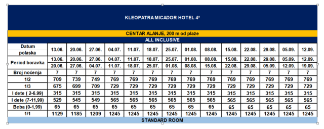 Kleopatra Micador Hotel 4* se nalazi u samom centru Alanje. Usluga u hotelu je all inclusive – na bazi otvorenog bufea – samoposluživanje za doručak, ručak i večeru, popodnevni kolač, kafa , lokalna alkoholna i bezalkoholna pića do 22h. Hotel poseduje glavni restoran na bazi švedskog stola, bar pored bazena, lobi bar. U dvorištu hotela se nalazi otvoren bazen za decu i odrasle. Posebno se doplaćuje: fitnes, vodeni sportovi, tursko kupatilo, sauna, masaže, bilijar, wi fi. Plaža se nalazi 200 m od hotela, ležaljke i suncobrani na plaži se naplaćuju dodatno, dok su ležaljke i suncobrani pored bazena besplatni.