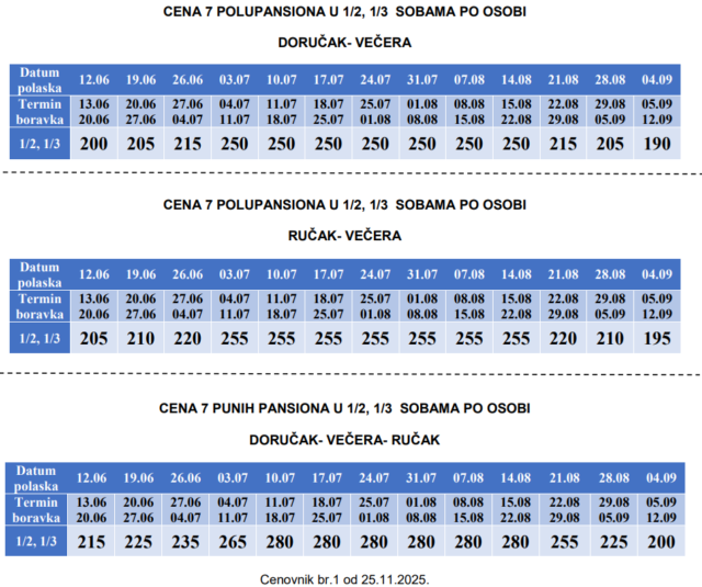 Napomena: ulazak u sobe prvog dana posle 14h, izlazak iz sobe je poslednjeg dana do 9h.